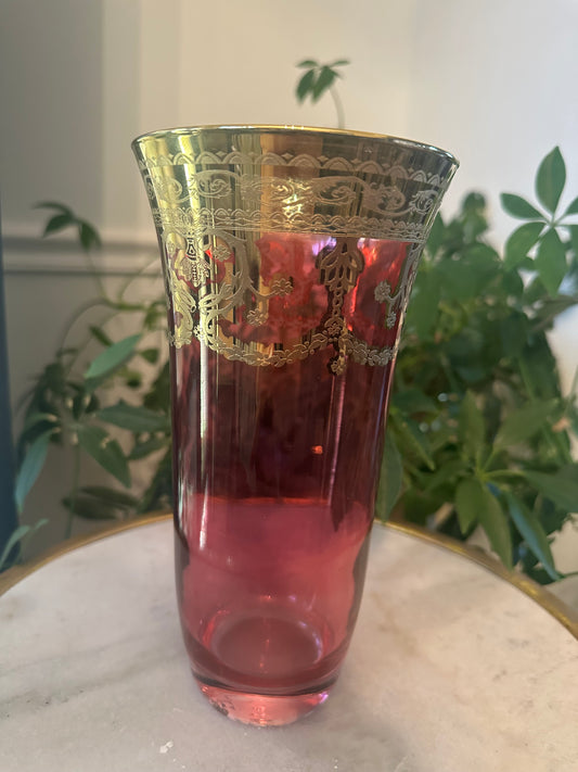 Cranberry Bohemian Glass Vase with Hand-Applied Gold Scrollwork