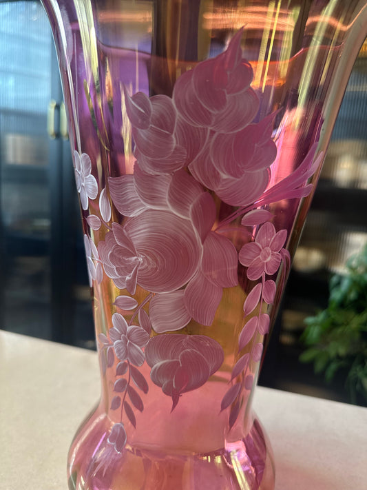 Cranberry Pink Iridescent Glass Vase with Gold Gilt